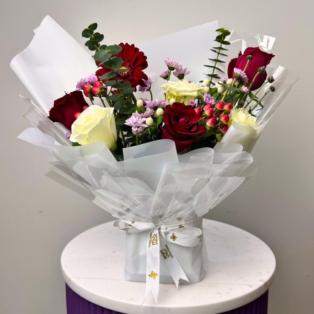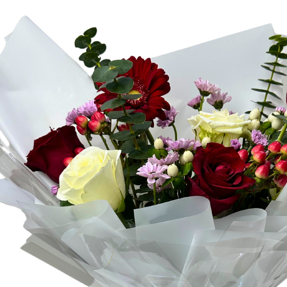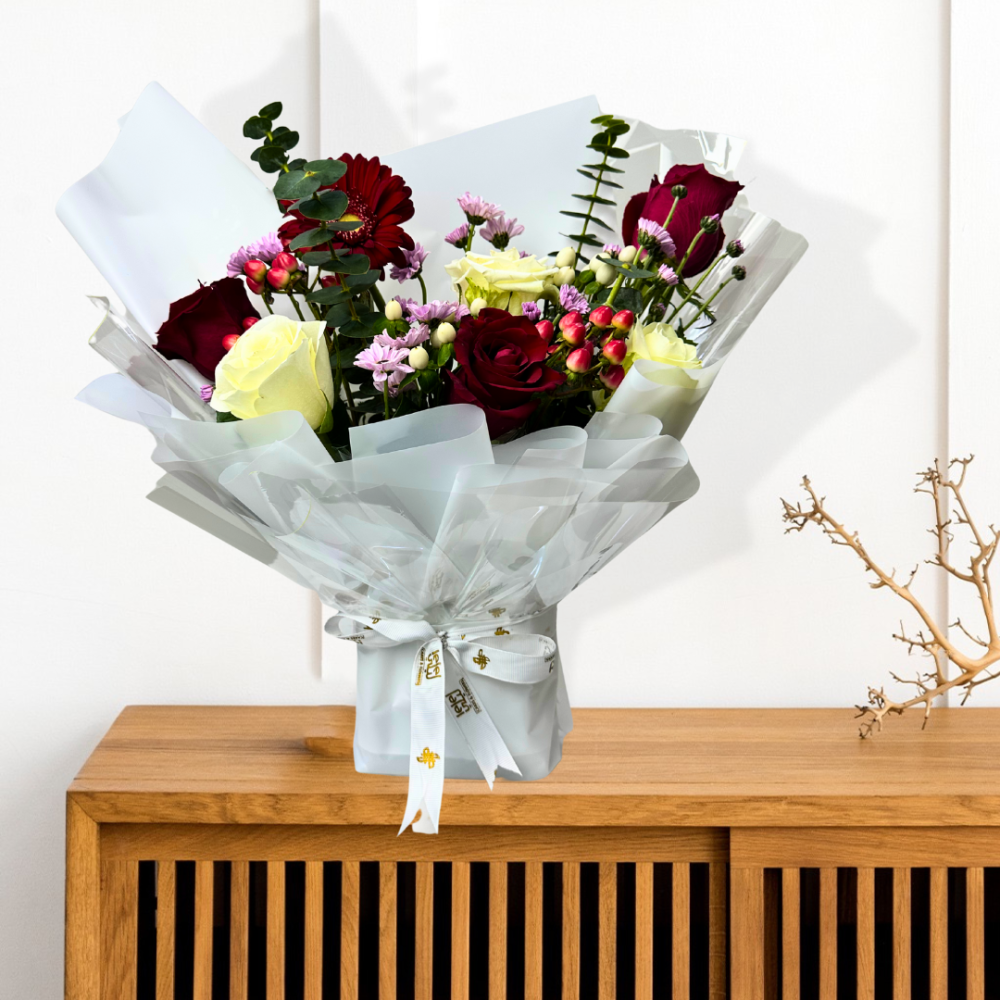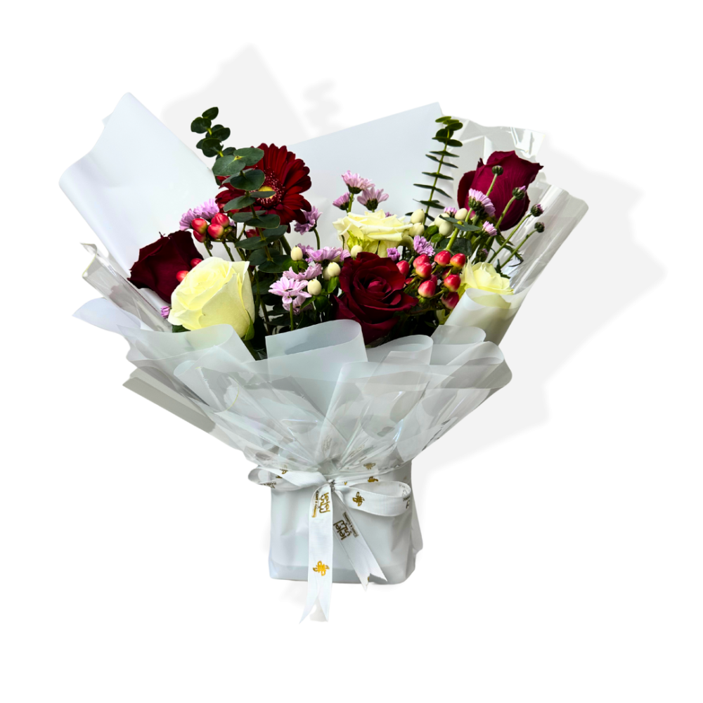 – تحفة فنية تجمع بين جمال الورد الأحمر النابض، نعومة الورد الأبيض، ولمسة ورد الهايبركم المميز.