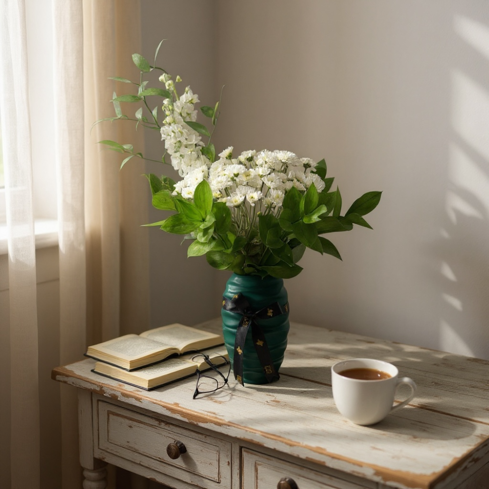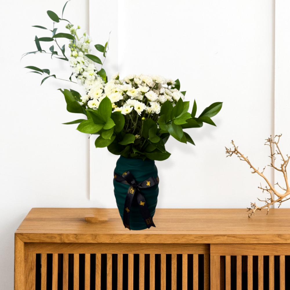 يتميز هذا التصميم الراقي بتوليفة فريدة من الورود البيضاء والاخضر بتناسق هادئ داخل فازة أنيقة تعكس الذوق الرفيع.