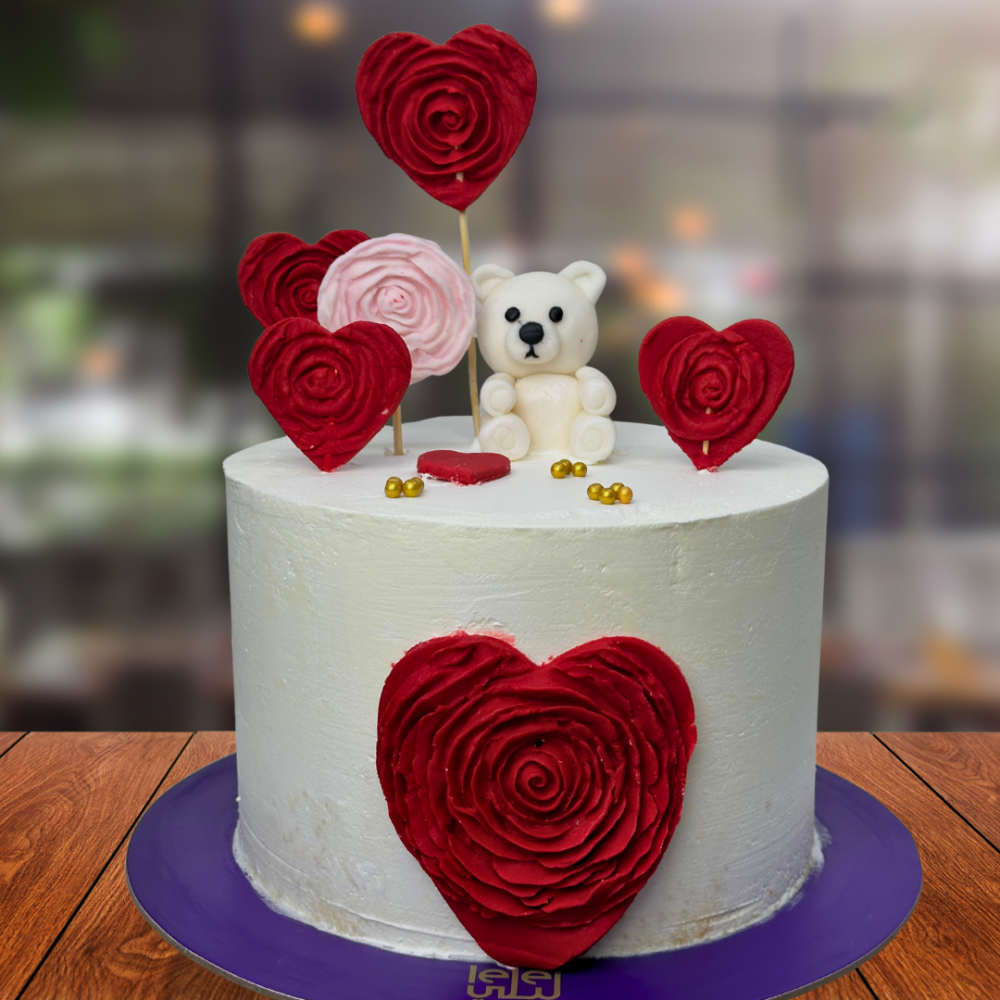 تأتي هذه الكيكة الساحرة مزينة بدبدوب جميل على سطحها وقلوب حمراء ملفتة تعبّر عن الحب والفرح بكل تفاصيلها.
