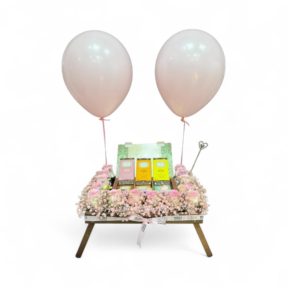 "أهدِ من تحب لمسة ساحرة مع باقة رامية من ليلي ورد وكيك. تجمع هذه الباقة الأنيقة بين أجمل الورود الطازجة مع بالون أنيق وشوكلت فاخرة، بحجم متوسط يناسب كل المناسبات. تصميمها الفريد وجودتها العالية تجعلها الهدية المثالية للتعبير عن مشاعرك بلمسة راقية. اطلب الآن وتمتع بخدمة التوصيل السريع!"