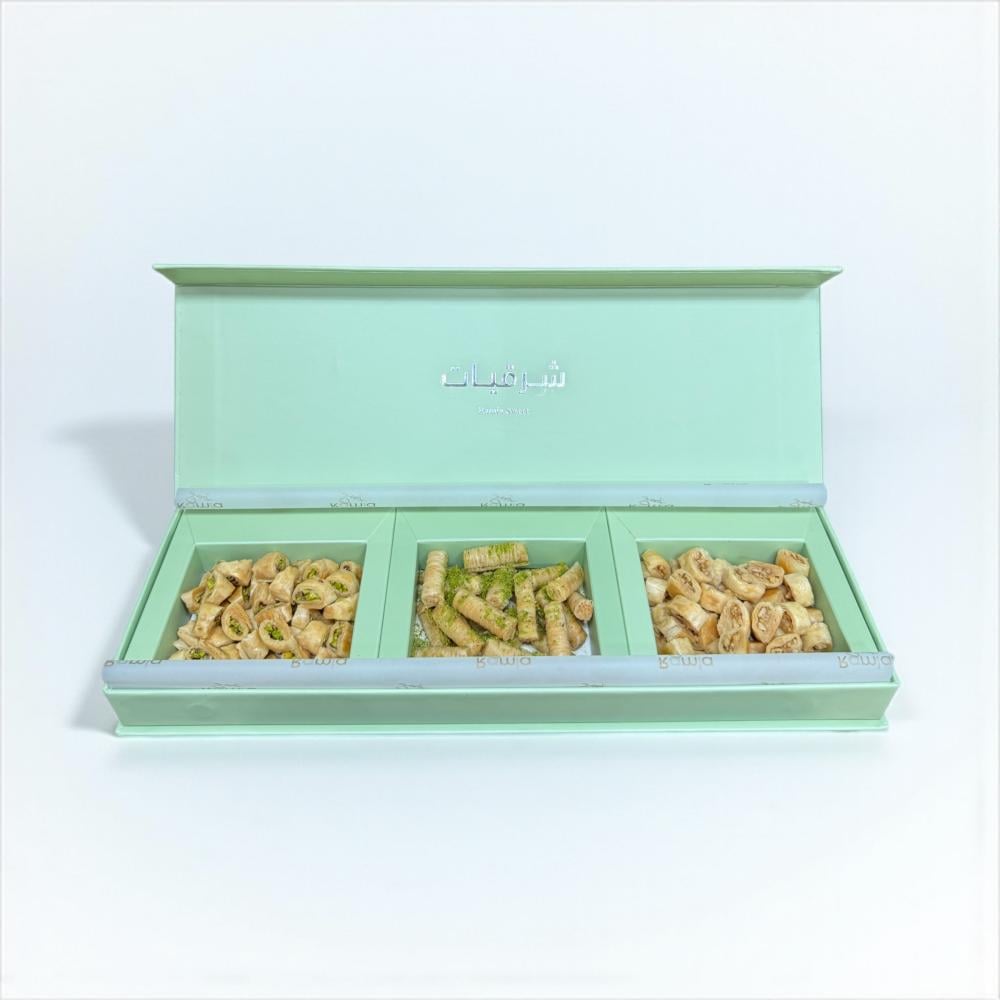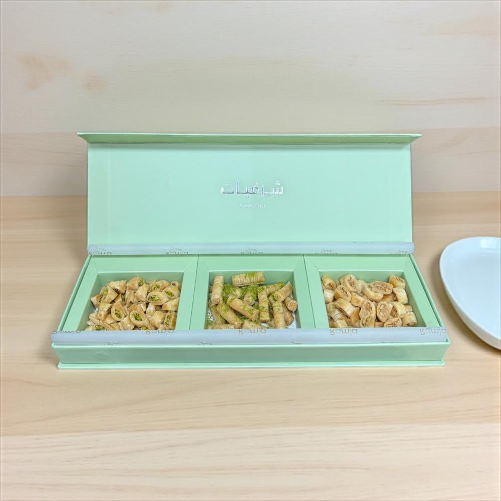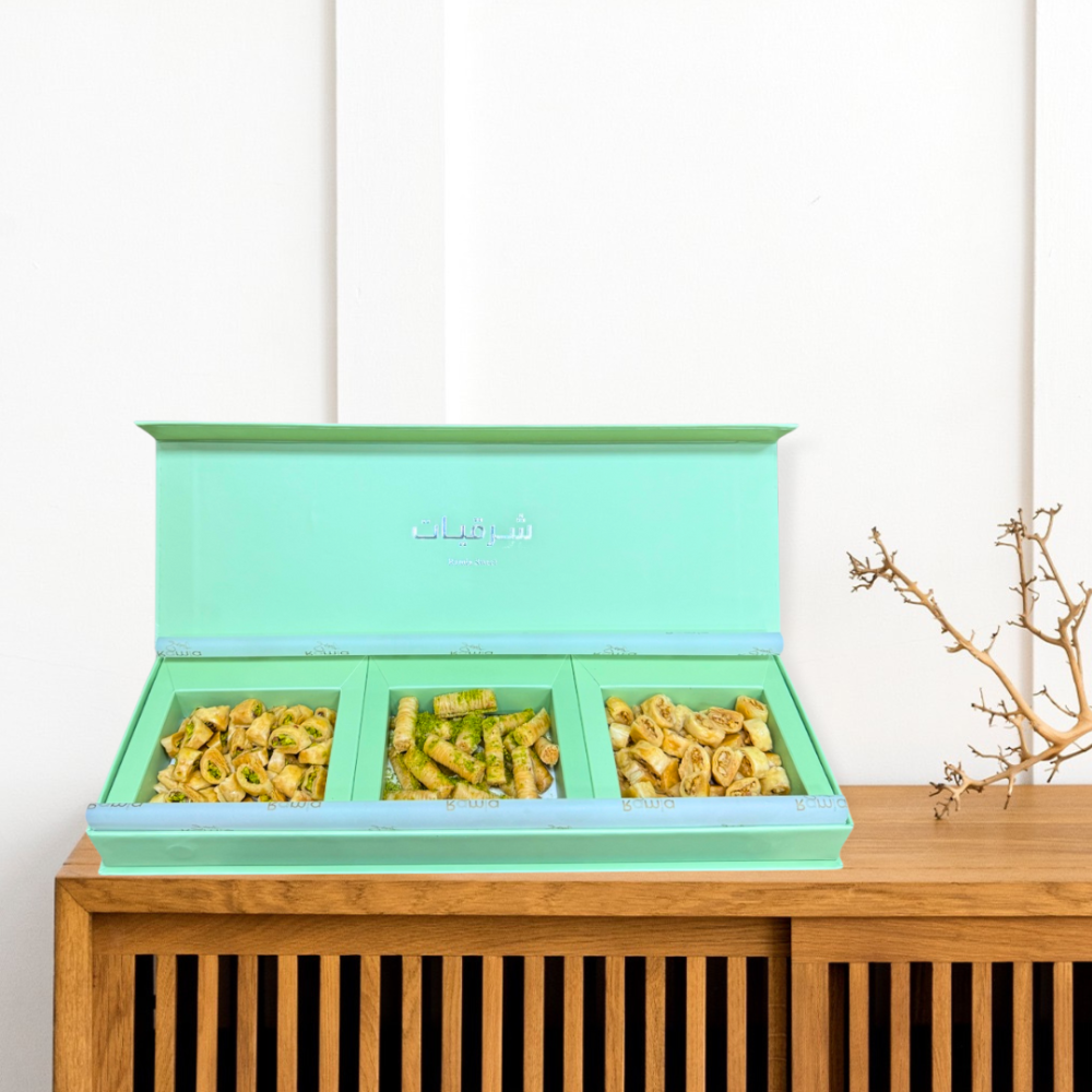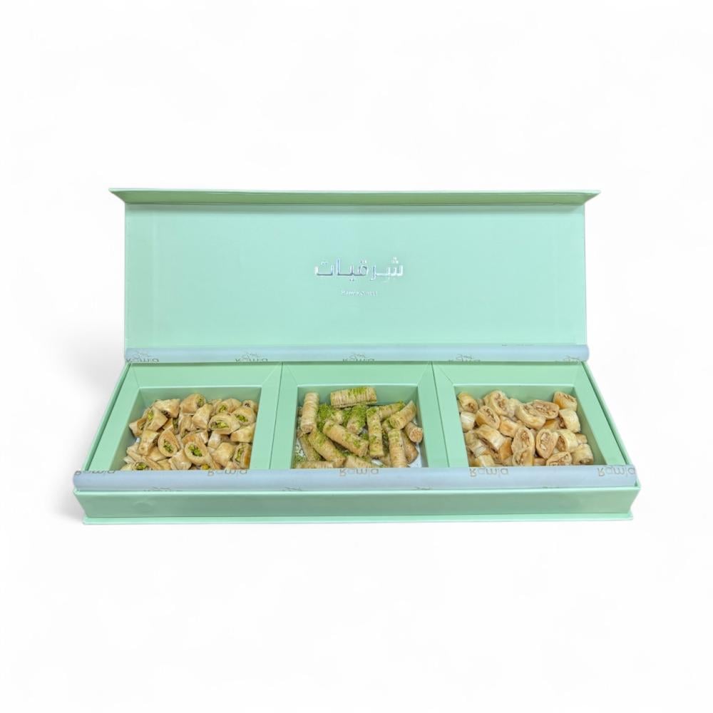 تضم هذه التشكيلة المختارة حشوات متنوعة من جوز بالقرفة، كاجو بالسمن البقري، وفستق حلبي بالسمن الحيواني،