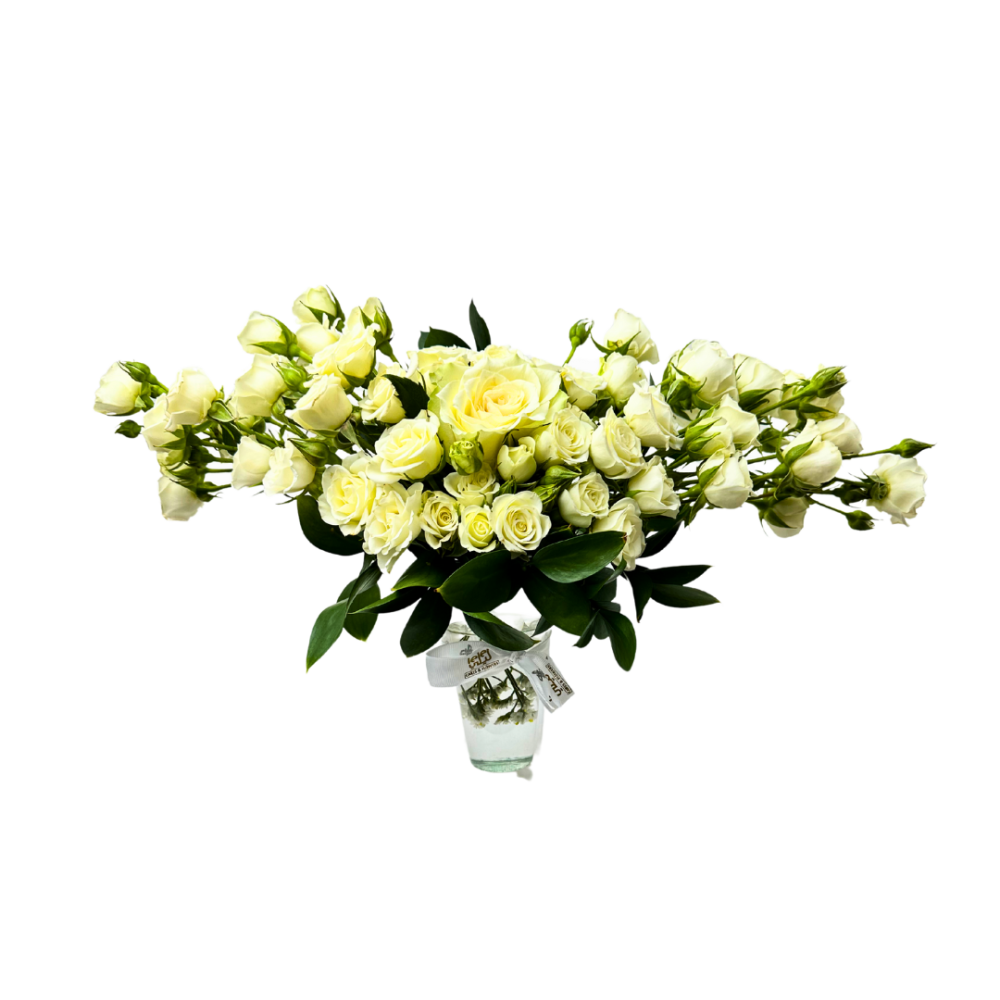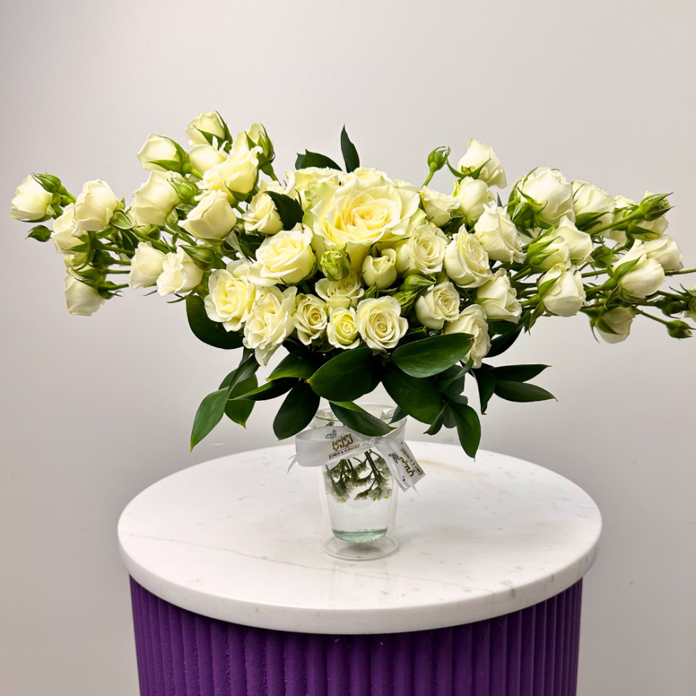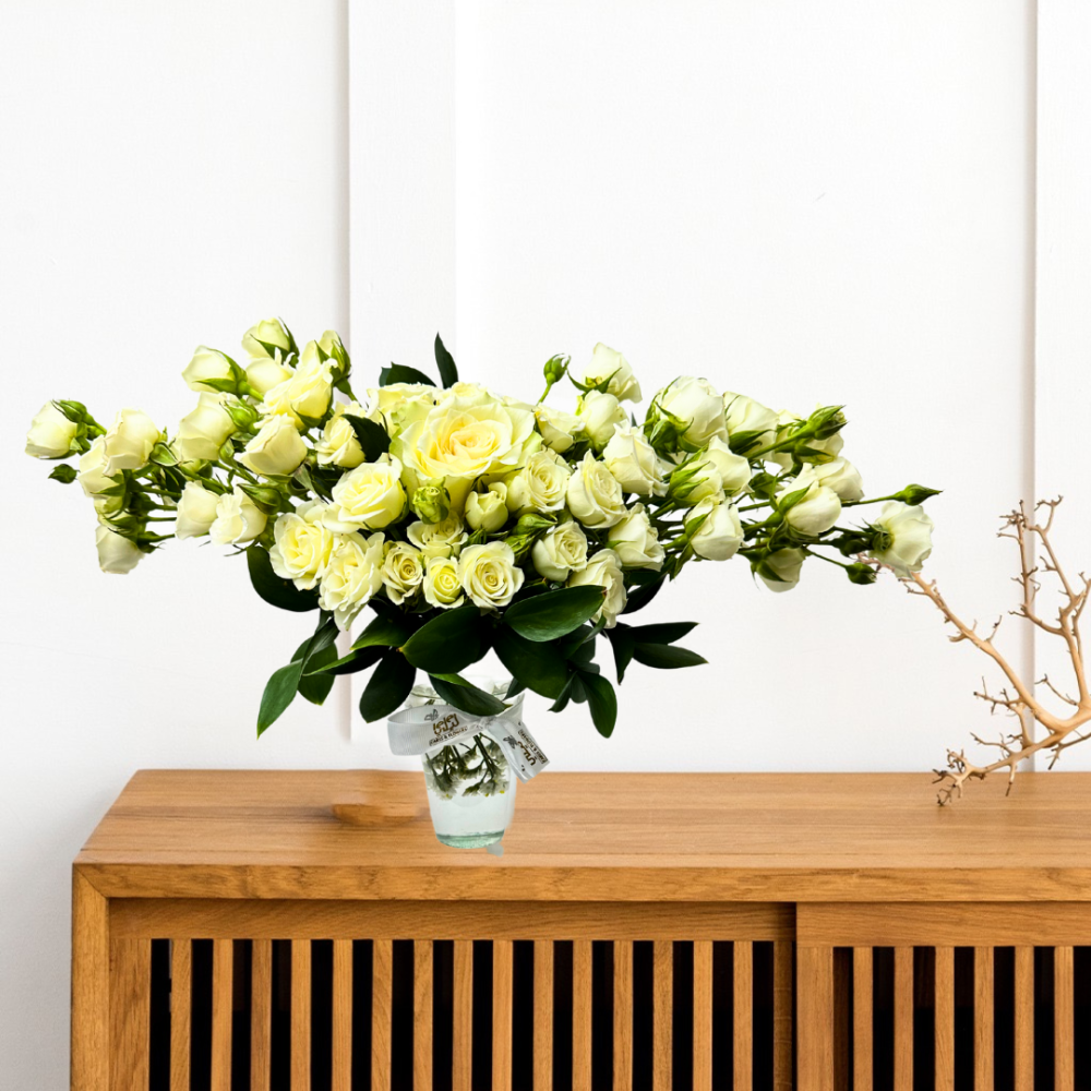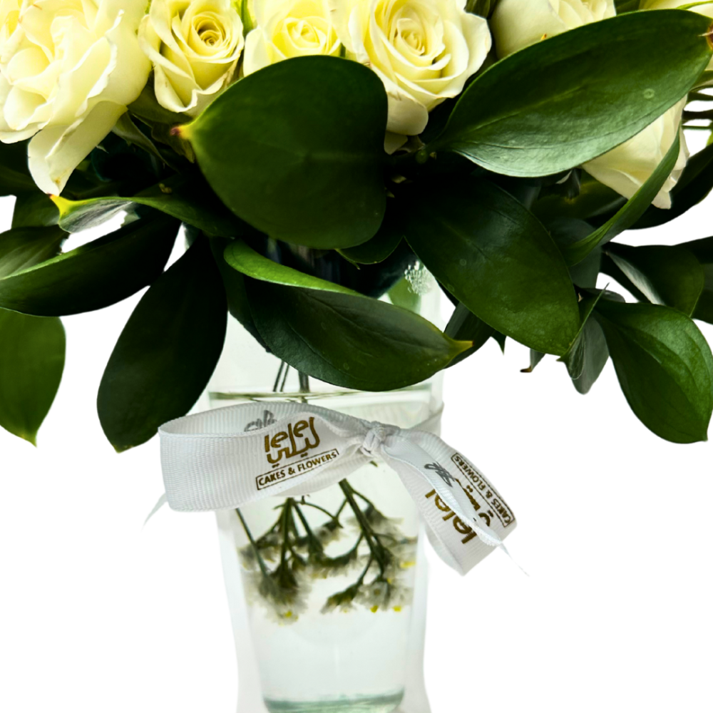 - 1 وردة جوري بيضاء كزهرة محورية تعبّر عن النقاء والمشاعر العميقة.
