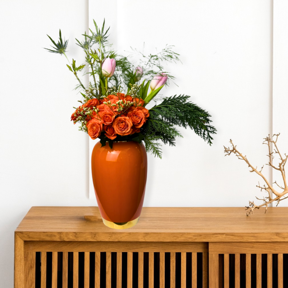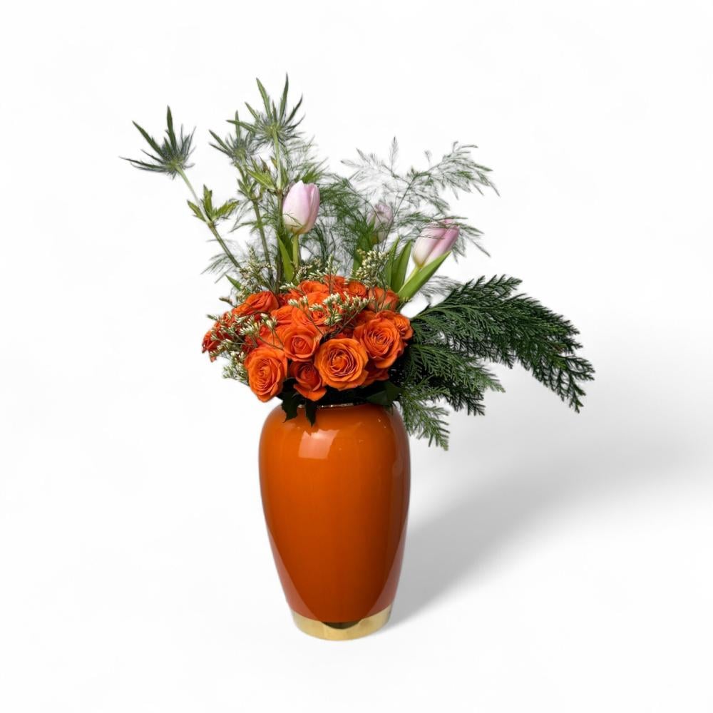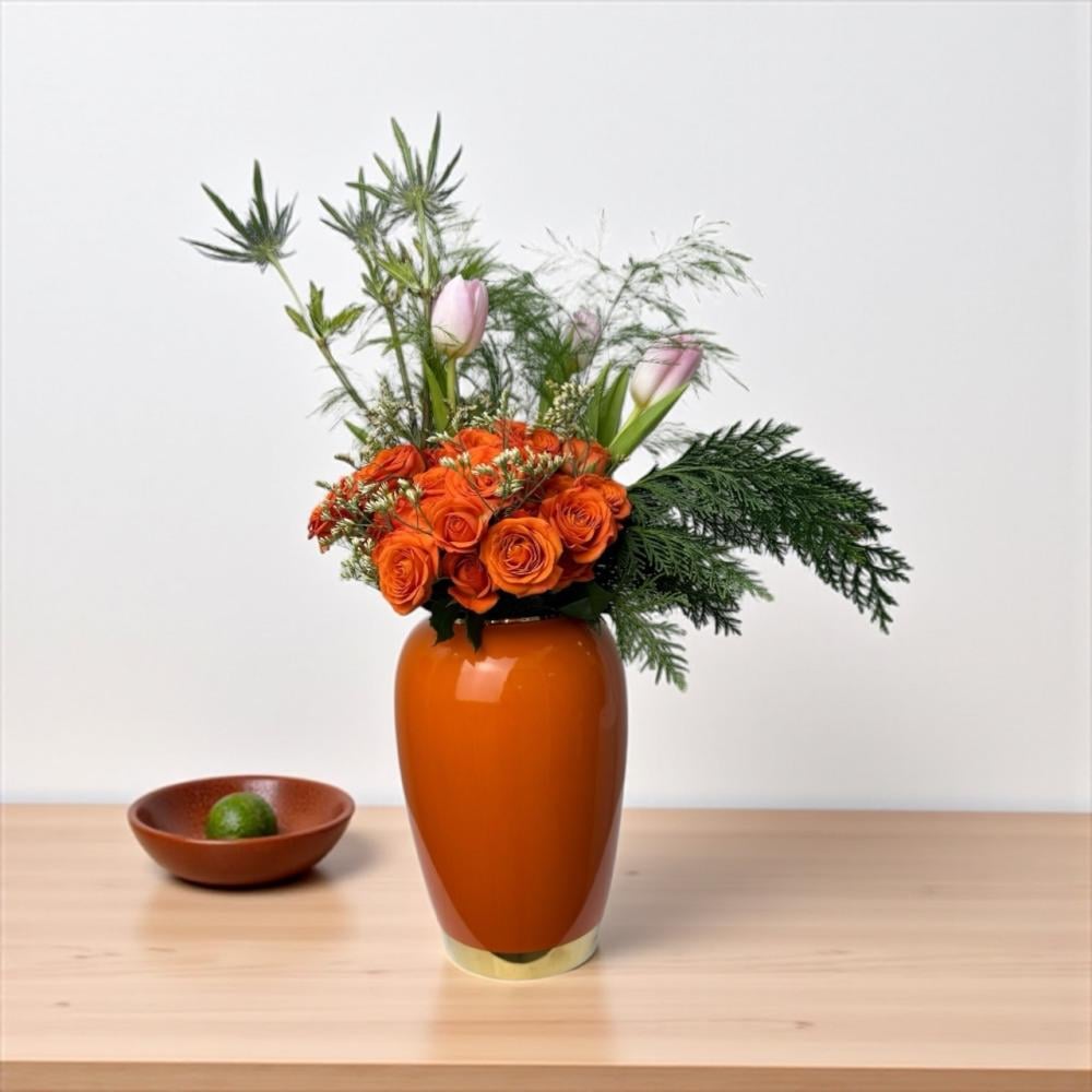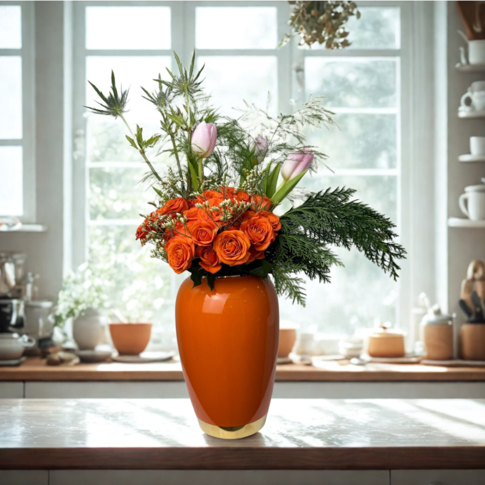 Add a touch of joy and vibrancy with the Baby Orange Vase from Lily, Roses & Cakes. This elegant ceramic vase comes in a perfect medium size and features fresh roses in vibrant orange hues, making it an ideal gift for special occasions or to add a warm touch to your home. Combine elegance and high quality with the Baby Orange Vase, and enjoy fast delivery so your gift arrives in perfect condition.
