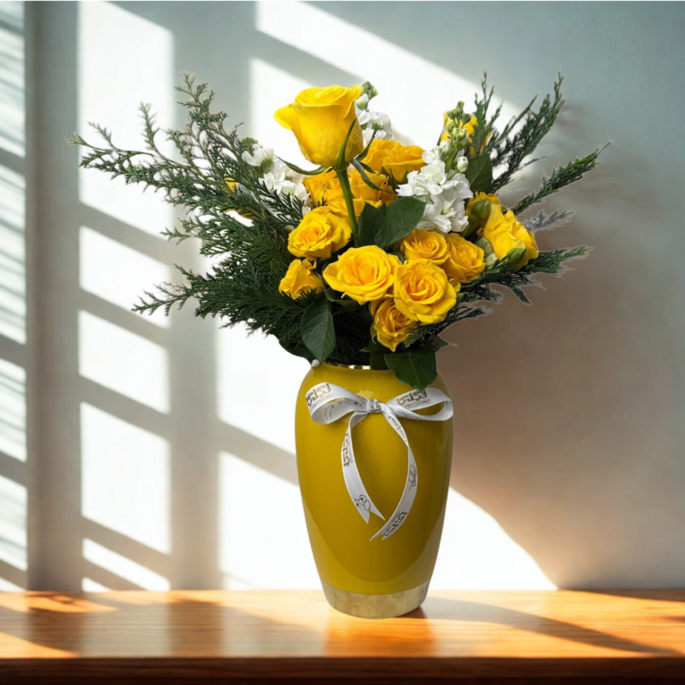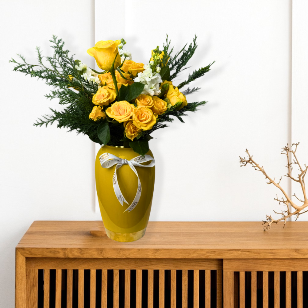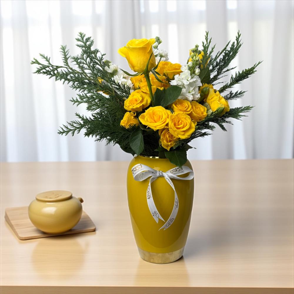 Add a touch of radiance to your special occasions with the Baby Yellow Vase from Lily, Roses & Cakes. Crafted from elegant ceramic, this medium-sized vase comes in an attractive yellow color and is decorated with fresh yellow roses, adding a touch of optimism and joy. Its modern design and bright color make it the perfect choice as a unique gift or as an elegant decorative piece to liven up your home. Add a touch of happiness to your moments with the Baby Yellow Vase, and order it now with express delivery.
