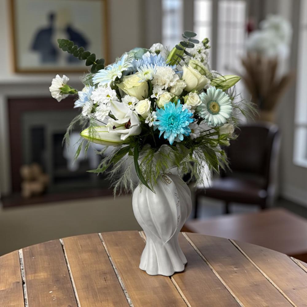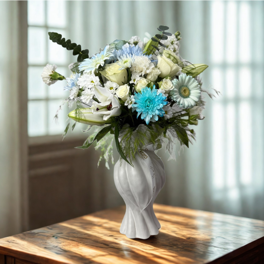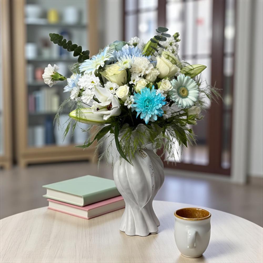 This vase combines a wonderful mix of maltula roses, baby roses, and lily roses in an elegant arrangement that gives the place a touch of vitality and elegance.