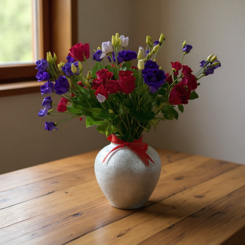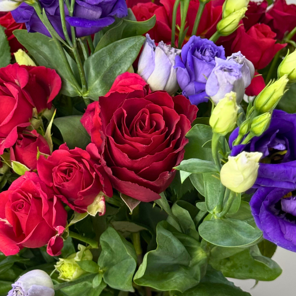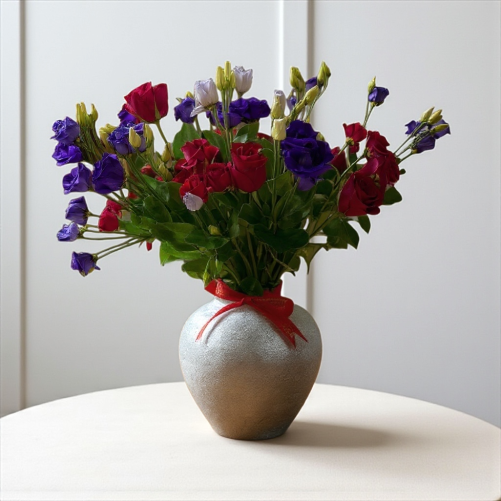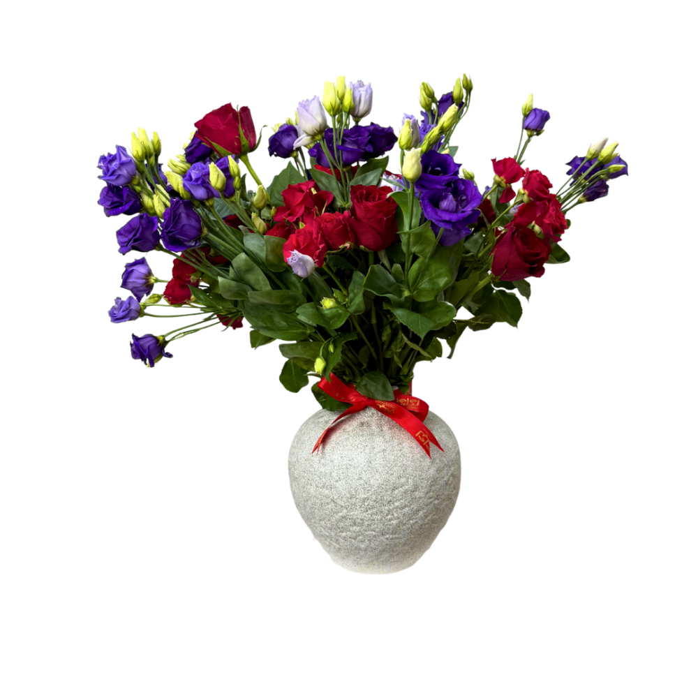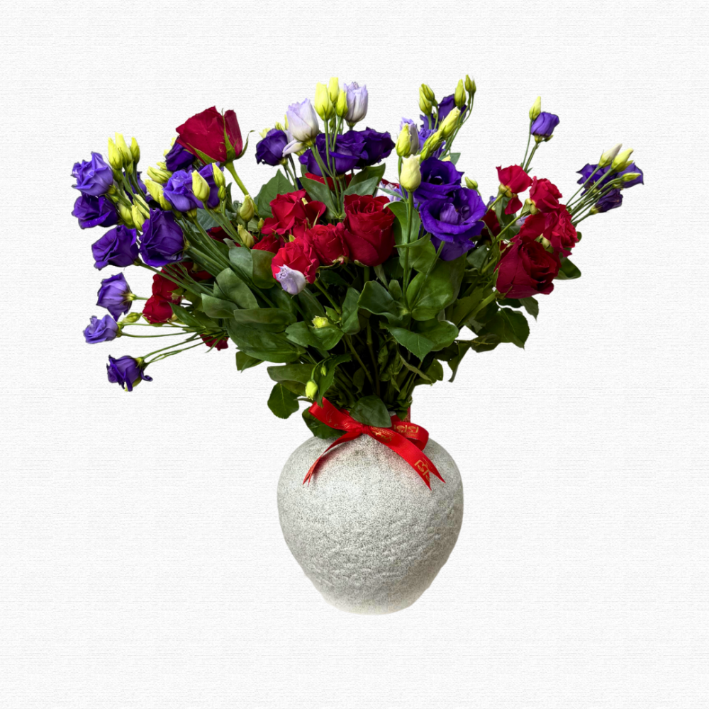 This vase features a stunning arrangement that combines enchanting red roses and unique baby roses in vibrant colors.