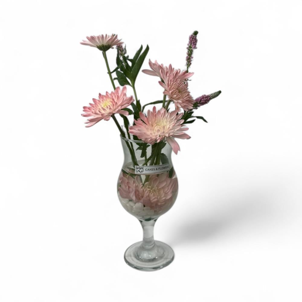 This tall stem glass cup features an eye-catching design embellished with veronica flowers and natural ruscus leaves.
