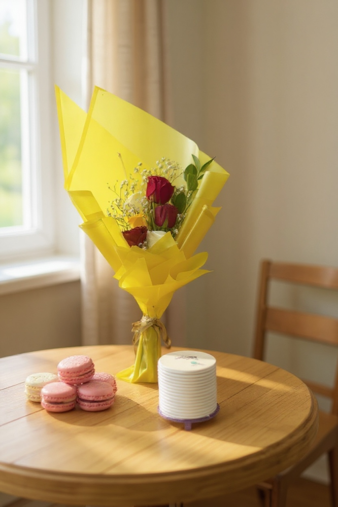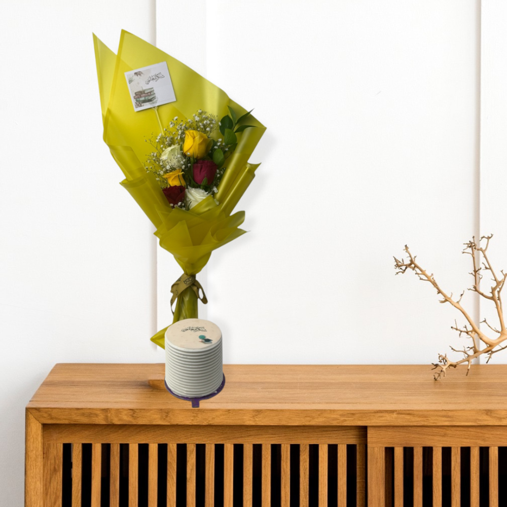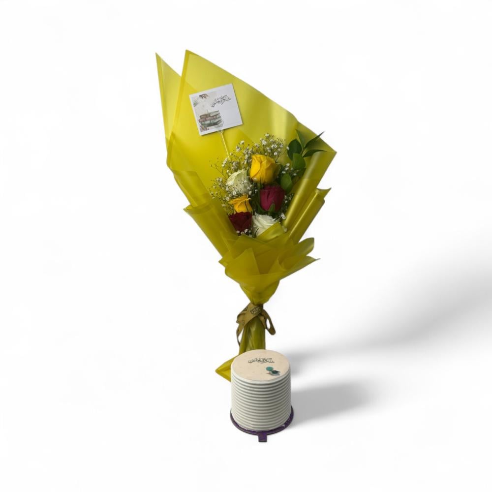A bouquet of red, yellow, and white roses in a luxurious arrangement evokes joy and appreciation. An ideal choice for thanking those who have been a blessing, conveying feelings of gratitude with a sophisticated touch that combines the sweetness of cake with the beauty of natural roses.